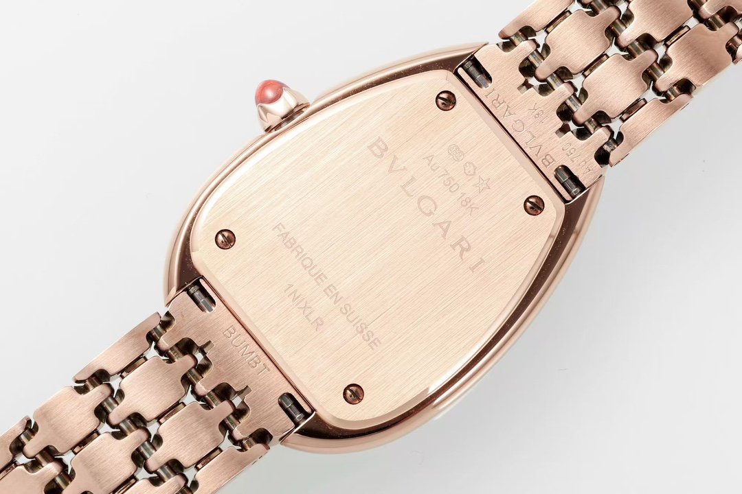 Заводная головка: Украшена выпуклым кабошоном из розового турмалина — драгоценным акцентом, характерным для ювелирных часов Bvlgari.